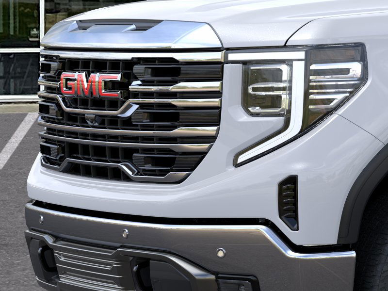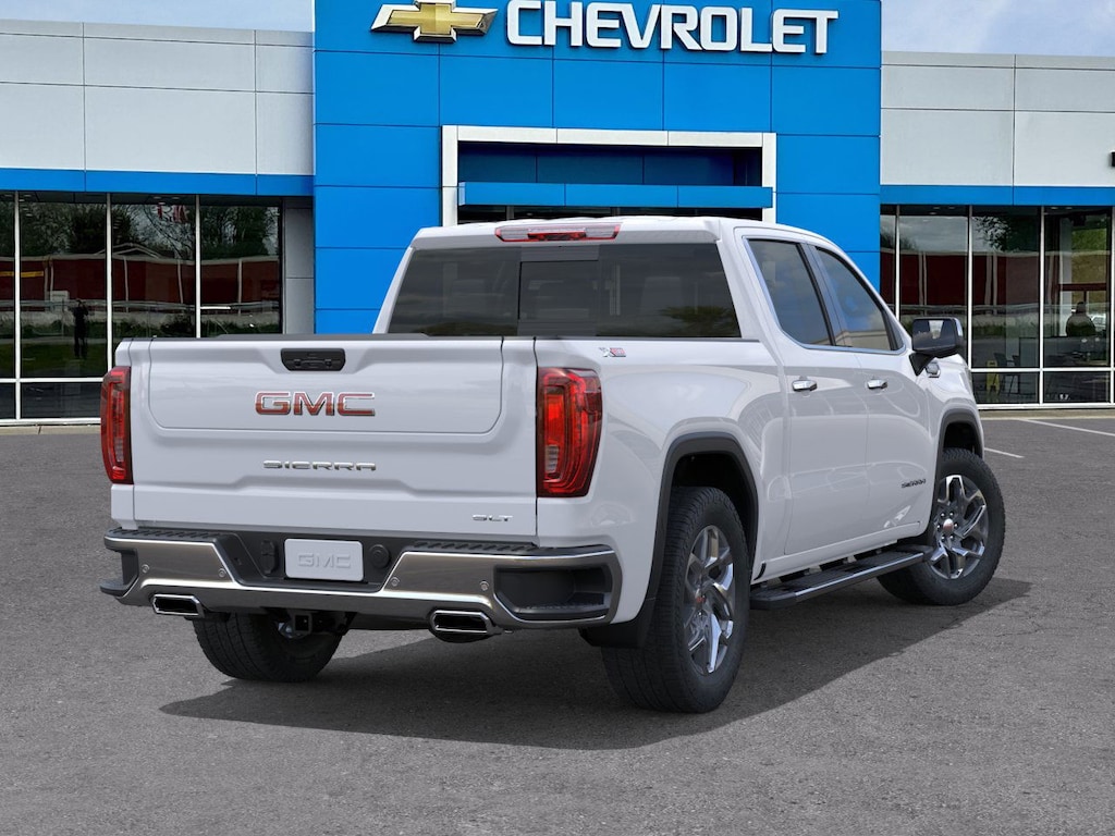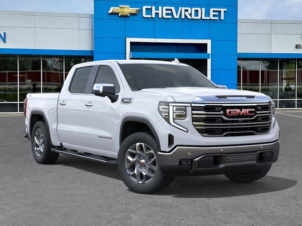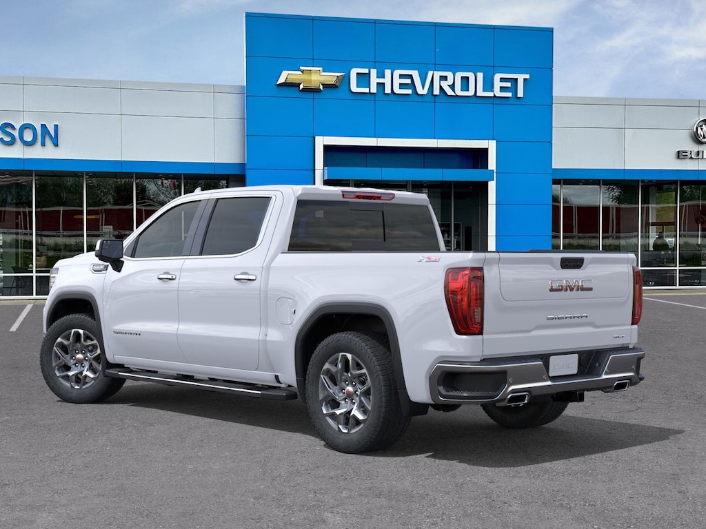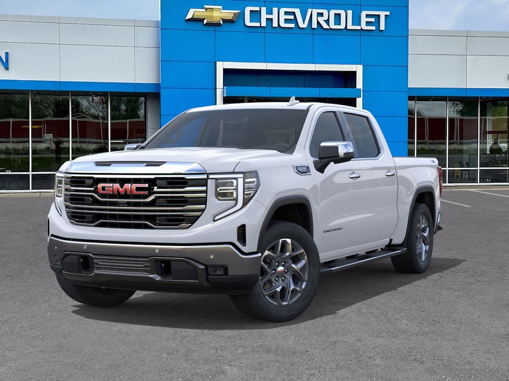 Glacier White Tricoat 2026 GMC Sierra 1500 SLT 4WD 10-Speed Automatic EcoTec3 5.3L V8 10-Speed Automatic, 4WD, Jet Black Leather.
