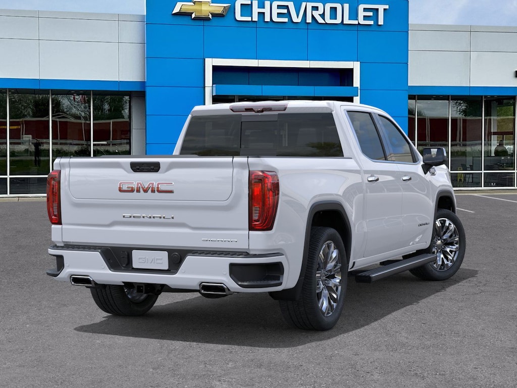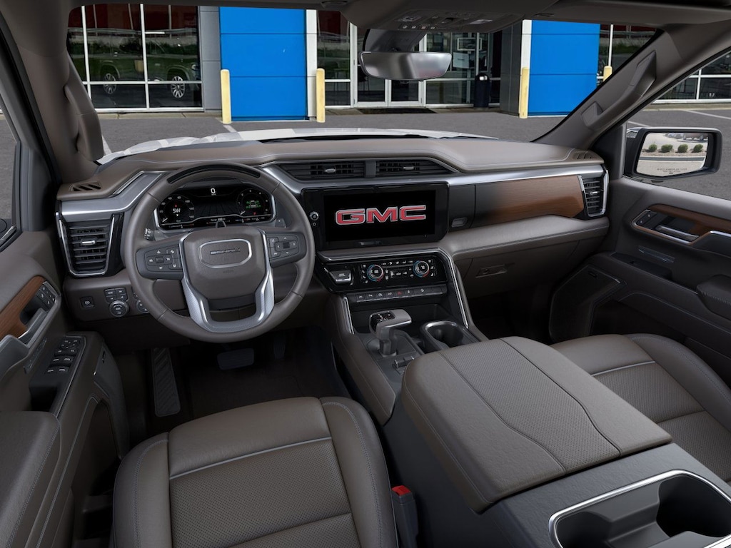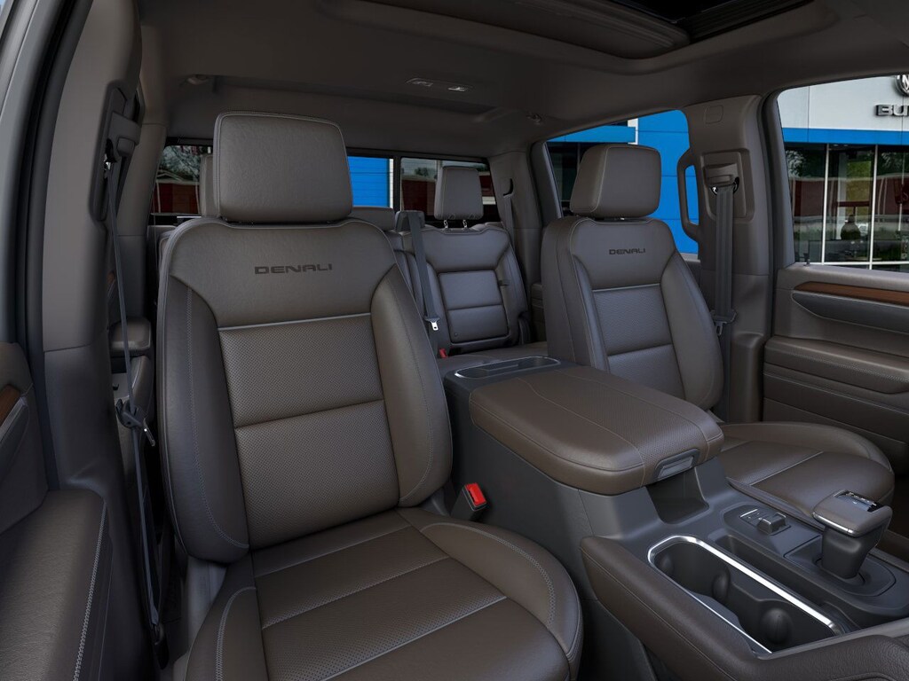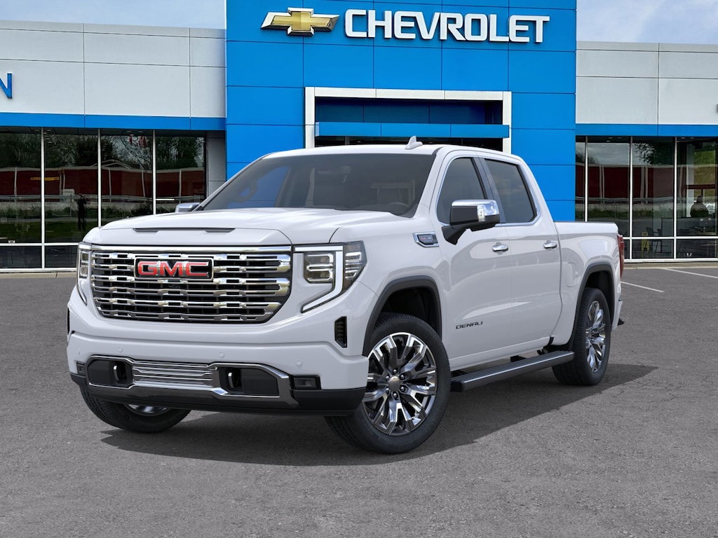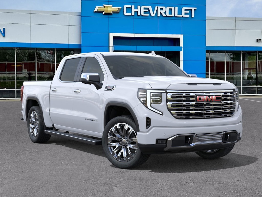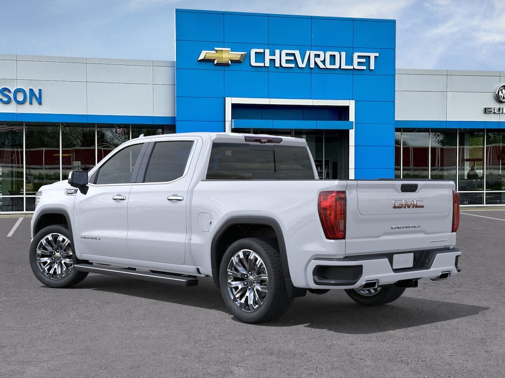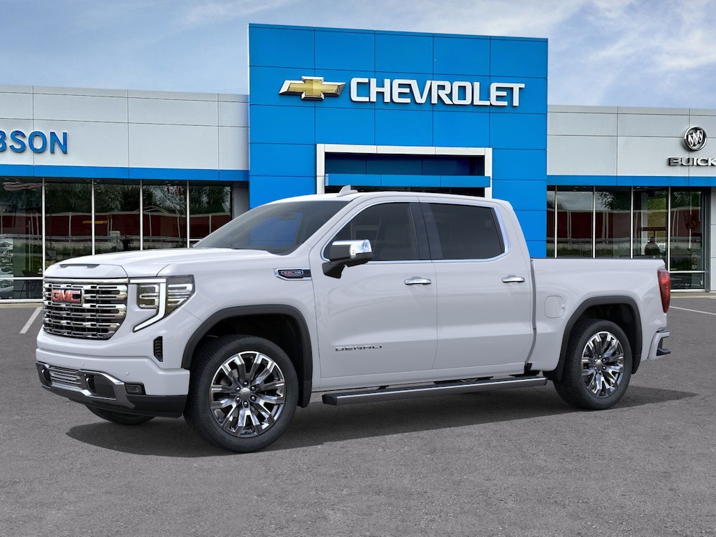 Glacier White Tricoat 2026 GMC Sierra 1500 Denali 4WD 10-Speed Automatic EcoTec3 6.2L V8 10-Speed Automatic, 4WD, Atmosphere/Brownstone Leather.