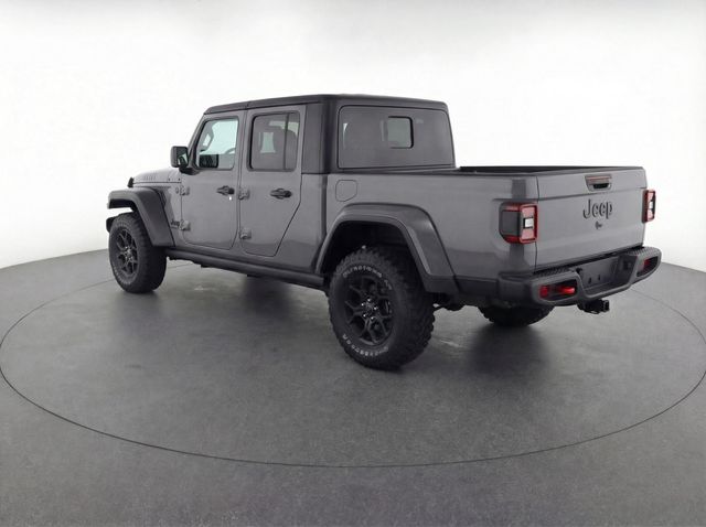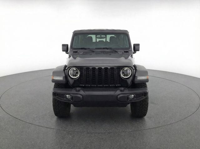 The Willys Package enhances off-road capability and style with features like Tru-Lok rear locking differential, Willys-tuned suspension, Off-Road Plus Mode, rock rails, and aggressive all-terrain tires. Exterior upgrades include a black grille, body-color fender flares, Willys hood decal, LED lighting, and premium bumpers with gloss-black accents, giving this Gladiator a bold, trail-ready look.